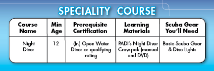 You’ll Love The Night Life! Diving at night is one of the most fascinating types of diving. The aquatic world is amazingly active once the sun goes down and many creatures you don't see during the day, come out at night. If you've dived a site during the day, you'll be surprised at how completely different the same site is at night. Even your local dive site takes on a new personality at night, as many underwater creatures and plant life (different from those you see during the day) are active at night. This course looks at the basic procedures for diving with lights, navigation techniques, buoyancy and communication considerations and guidelines for choosing dive sites at night. Experience a whole new underwater world! To make your Certification card special, consider making a donation to PADI® Project Aware ![]() ENQUIRY |