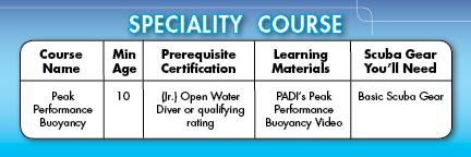 ![]() ![]() ![]() ![]() Mastering your Buoyancy is one of the most important achievements you will make in your diving career. To be able to hover without motion, to use the air in your lungs to control your buoyancy and be able to reduce the amount of lead weight you dive with are all very much within reach for the Peak Performance Buoyancy Specialist. This very popular course is an ideal preparation for divers looking at a career in diving or for the diver who just wants to gain total control underwater. Your Instructor will streamline your equipment, and give you a range of skills to ascertain the correct weight for you to dive with. Then with the aid of a few training aids, you will be splashing around in no time. Within a couple of hours you will be in control. What is neutral buoyancy? Scuba divers like to be neutrally buoyant so they neither sink nor float. It can be a tricky thing. Divers who’ve mastered the highest performance levels in buoyancy stand apart. You’ve seen them underwater. They glide effortlessly, use less air and ascend, descend or hover, almost as if by thought. They interact gently with aquatic life and affect their surroundings minimally. The PADI Peak Performance Buoyancy course refines the basic skills you learned as a PADI Open Water Diver and elevates them to the next level.What You Learn