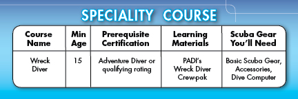 ![]() ![]() ![]() Want To Know How To Get Wrecked? Wrecks are an attraction for many divers, whether it's the history surrounding the wreckage, the challenge of identifying the wreck, or simply the fish life attracted by the artificial reef. Whether sunk on purpose as an artificial reef or the result of mishap, wrecks open fascinating windows to the past. Most divers find wrecked ships, airplanes and even automobiles nearly irresistible because they’re intriguing to explore, exciting avenues of discovery, and usually teeming with aquatic life. The PADI Wreck Diver course teaches you the ins and outs of rewarding, responsible wreck diving. Wrecks by their definition can present hazards that are not encountered in reef diving such as overhead environments, depth and navigation limitations. Our PADI Wreck Specialty program will teach you how to identify and manage these hazards so you can safely enjoy and fully appreciate the thrill of wreck diving.The Fun Part The fun part of the PADI Wreck Diver course is visiting wrecks, unlocking mysteries and starting to gain the knowledge and experience that allows you to see things that others overlook. Sometimes, only the trained, experienced eye recognizes that a small hole or open door likely caused the vessel’s demise.