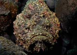 The Stonefish is thought to be the most venemous fish in the world. It reaches approximately 35cm in length and has 13 dorsal fin spines all as sharp as needles with a gland/sac of highly toxic venom at their base. These spines are strong and can easily puncture unprotected skin such as a carelessly placed foot. The sting is extremely painful. Thought to be the cause of many deaths, however there have been no recorded Australian deaths. An antivenom developed in 1959 makes the risk of death even less likely. Prevention is always better than a cure so remember to wear sturdy soled shoes when walking in the water, especially in rocky areas. Stonefish eat crustaceans and small fish, they lay virtually motionless and are well camoflaged looking like an encrusted rock or piece of coral. They patiently wait until their prey passes by and then they stike with amazing speed, so if you want to photograph this you will need a high speed camera.. They are two types of stone fish found in Australia the Reef Stonefish and the Estuary Stonefish, the way to tell them apart is the placement of their eyes. A Reef Stonefish has a deep depression between its eyes and the Estuary Stonefish have elevated eyes seperated by a bony ridge. The Stonefish are by large brown or grey with patches of red, orange and yellow. The Reef Stonefish is found in tropical waters all around Australia including Ningaloo and the Great Barrier Reef. Preyed on by sharks and rays you will generally find them on the bottom in rubble or coral, hiding under rocks and ledges, but they have also been known to bury themselves in the sand with their pectoral fins. The Aboriginals of Australian have a dance that aims at educating their children about the dangers of stonefish. A carved replica of the stonefish is made out of clay and the dancer steps on it... He then wriths in pain and the dance ends in the death of the dancer.