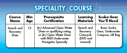 - Search and recovery dive planning, organization, procedures, techniques and how to deal with potential problems